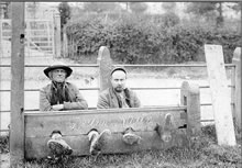 In 1882 they were removed from their original position by the lord of the manor, Mr E Hussey, who had them repositioned to St Michael’s and All Angels Churchyard. They can be seen in this picture inside the church gates with Church Hill behind. The photograph was taken with 2 local men posing as miscreants for a joke.
